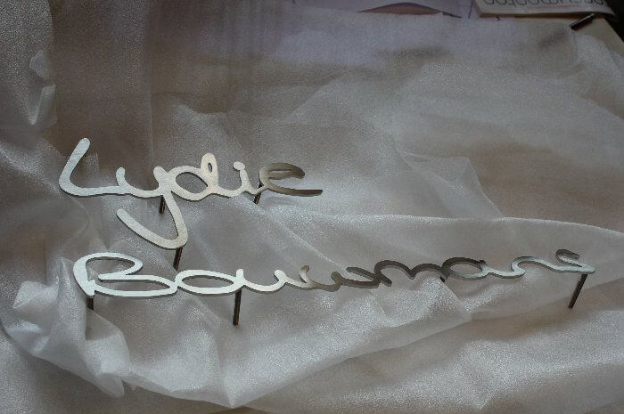 “Lydie: in haar eigen handschrift geschreven. We gebruiken haar handgeschreven naam en sneden deze uit in RVS. Het eigen handschrift maakt het grafmonument van Lydie nog persoonlijker. Bovendien hebben we in het puntje op de i haar vingerafdruk gegraveerd.