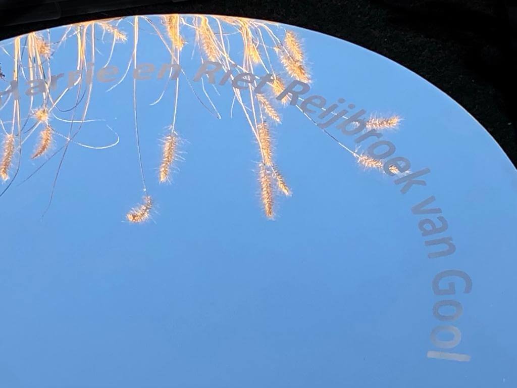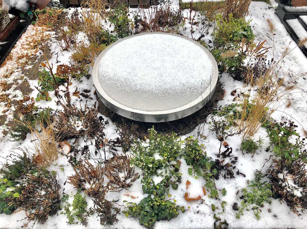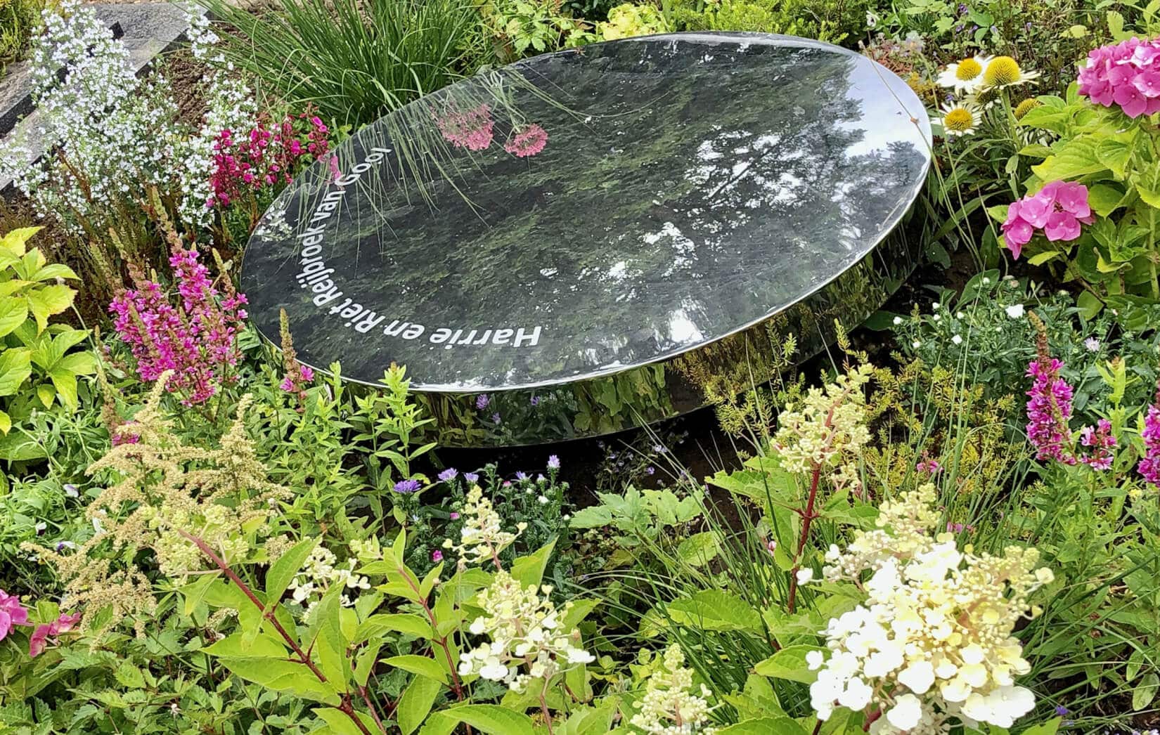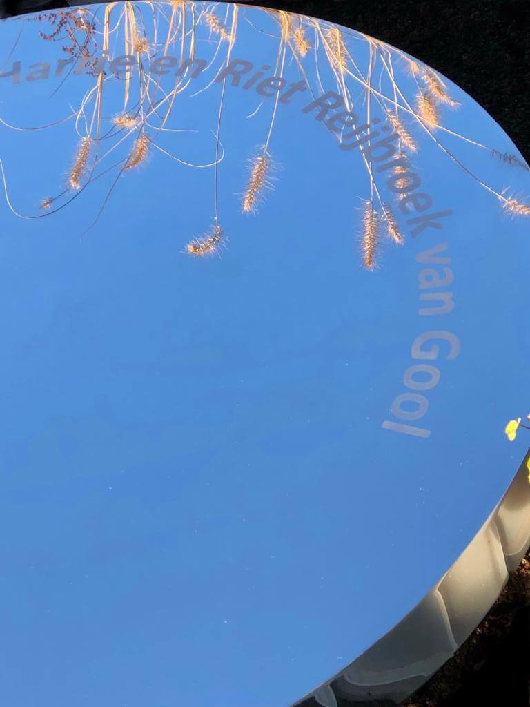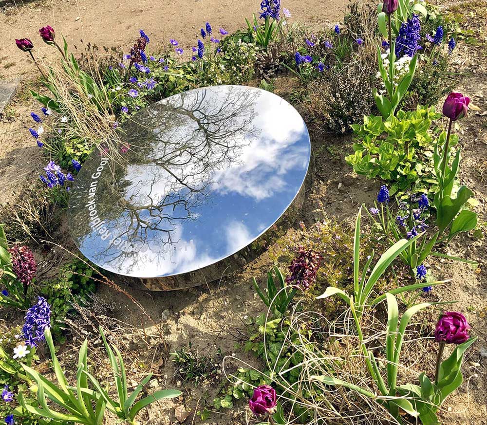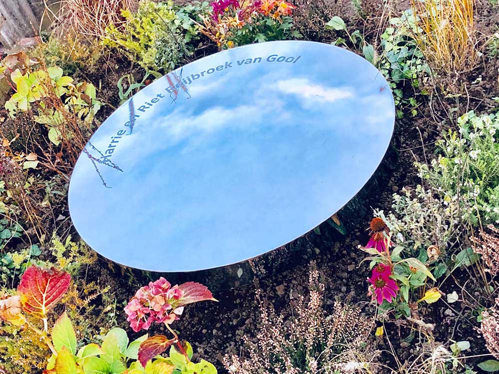 Moderne en kunstzinnige grafzerk van hoogglans gepolijst RVS – een heldere en zuivere spiegel die de hemel en de bloemen weerspiegelt. Een bijzonder monument dat lichtheid en puurheid uitstraalt.
