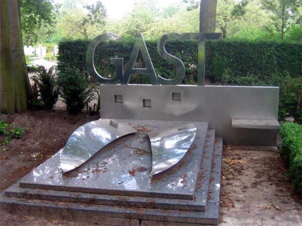 De letters GAST zijn gemaakt van gepolijst edelstaal INOX RVS 316. Ook de vleugels die het graf toedekken zijn van gepolijst RVS. De achterwand van het graf met zitje zijn van gematteerd RVS.