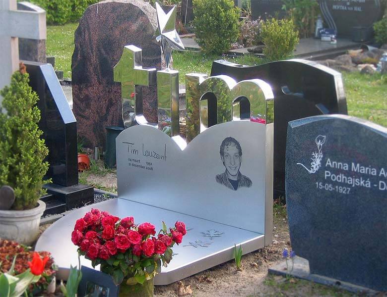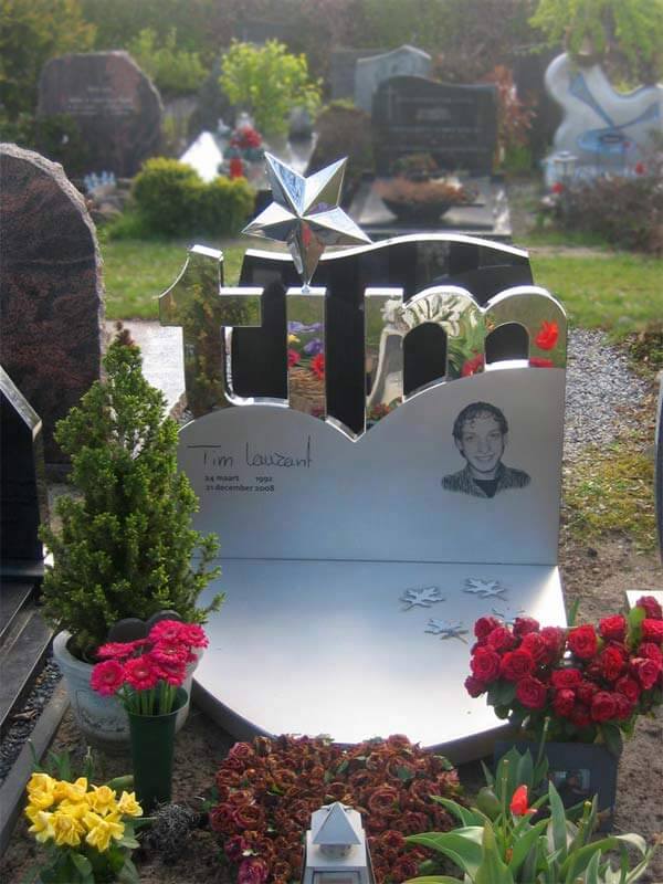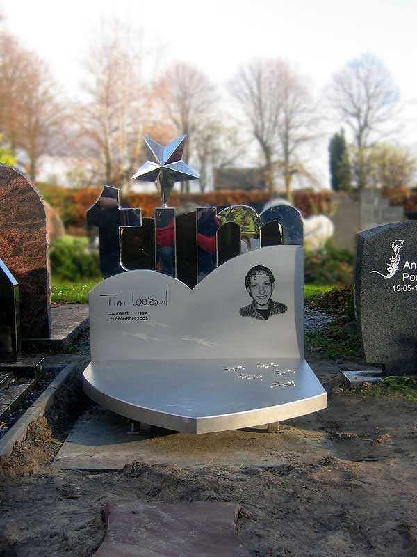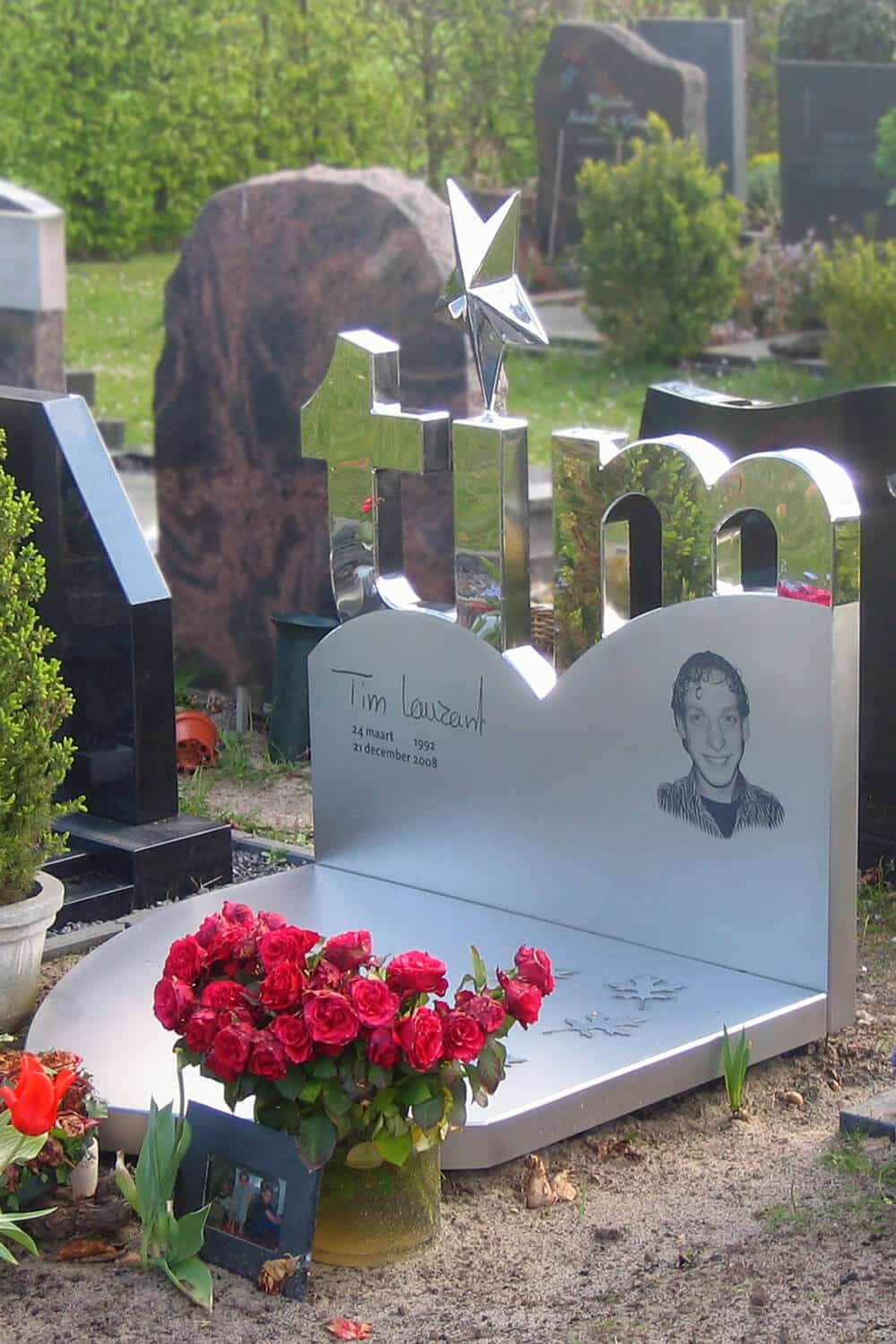 Een helder en sprankelend monument van RVS. Het grafmonument is net zoals Tim was: creatief, helder en opgeruimd. Uit een hart verrijst de naam van Tim in spiegelende doosletters. Het staat symbool voor de intense liefde die de nabestaanden voor Tim voelen. Met laser is een foto en zijn naam in zijn eigen handschrift aangebracht.