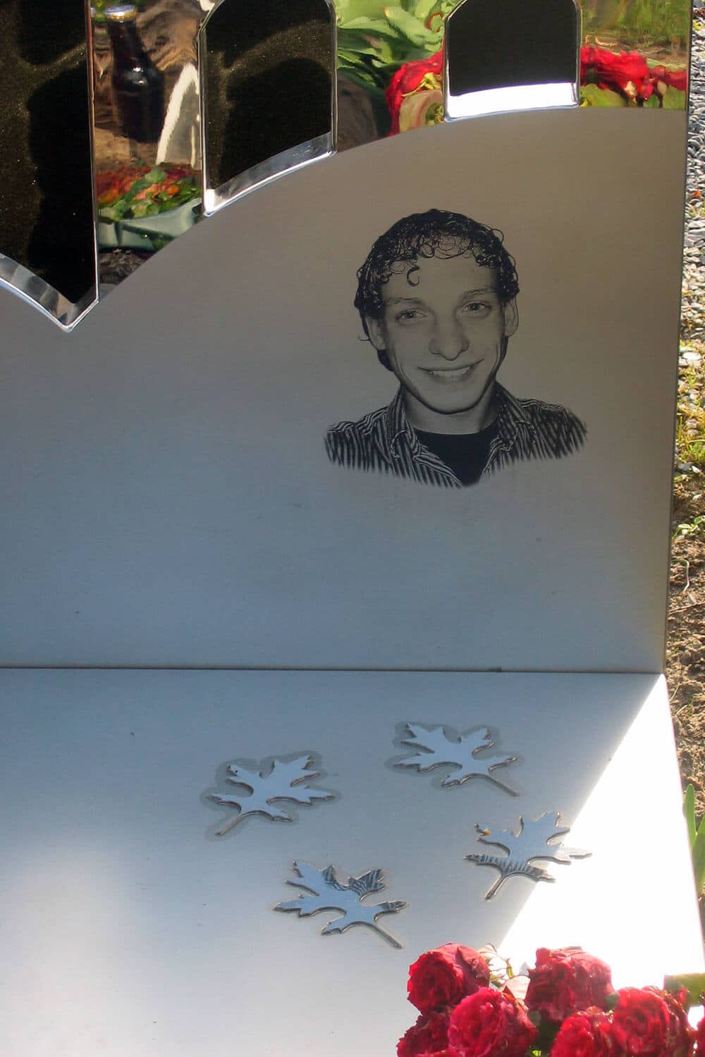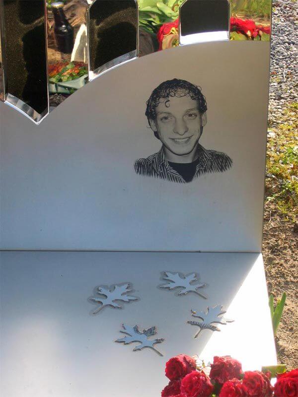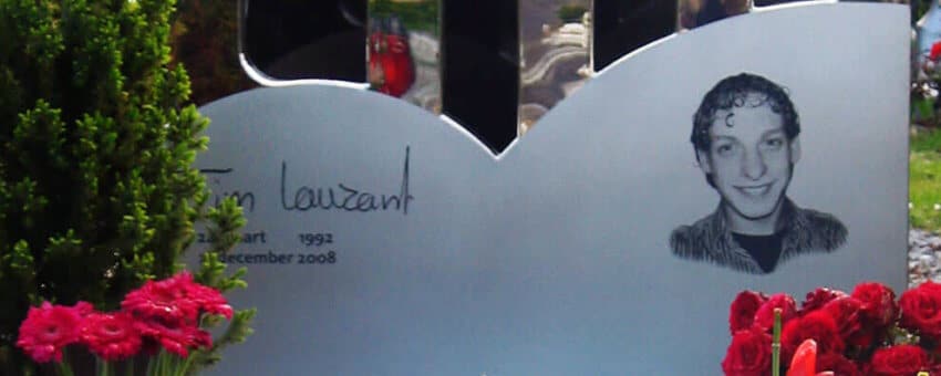 In het verticale deel werd Tim’s foto, zijn handschrift en de datums gelaserd. Laseren is loepzuiver en vrijwel onderhoudsvrij. Bovendien is het volledig vlak zodat er geen vuil aan hecht.