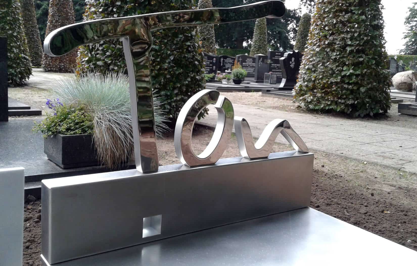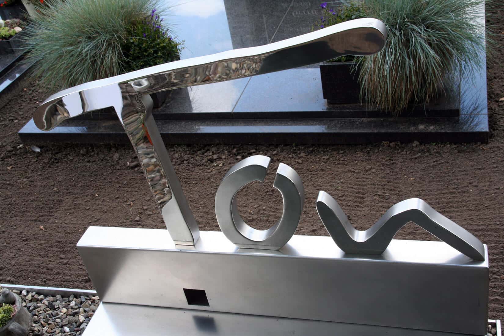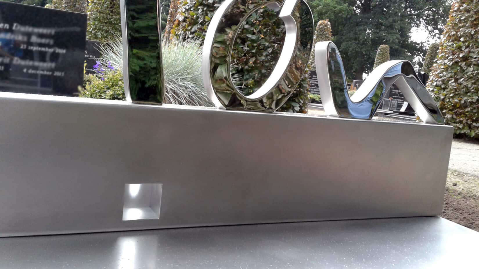 Het RVS in het moderne grafmonument is geschuurd en de letters zijn hoogglans gepolijst (spiegelend).