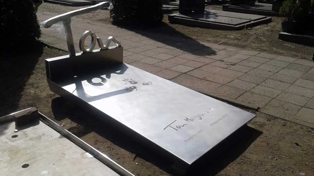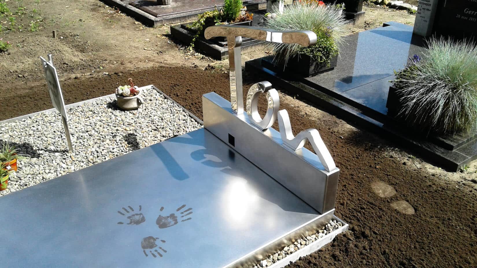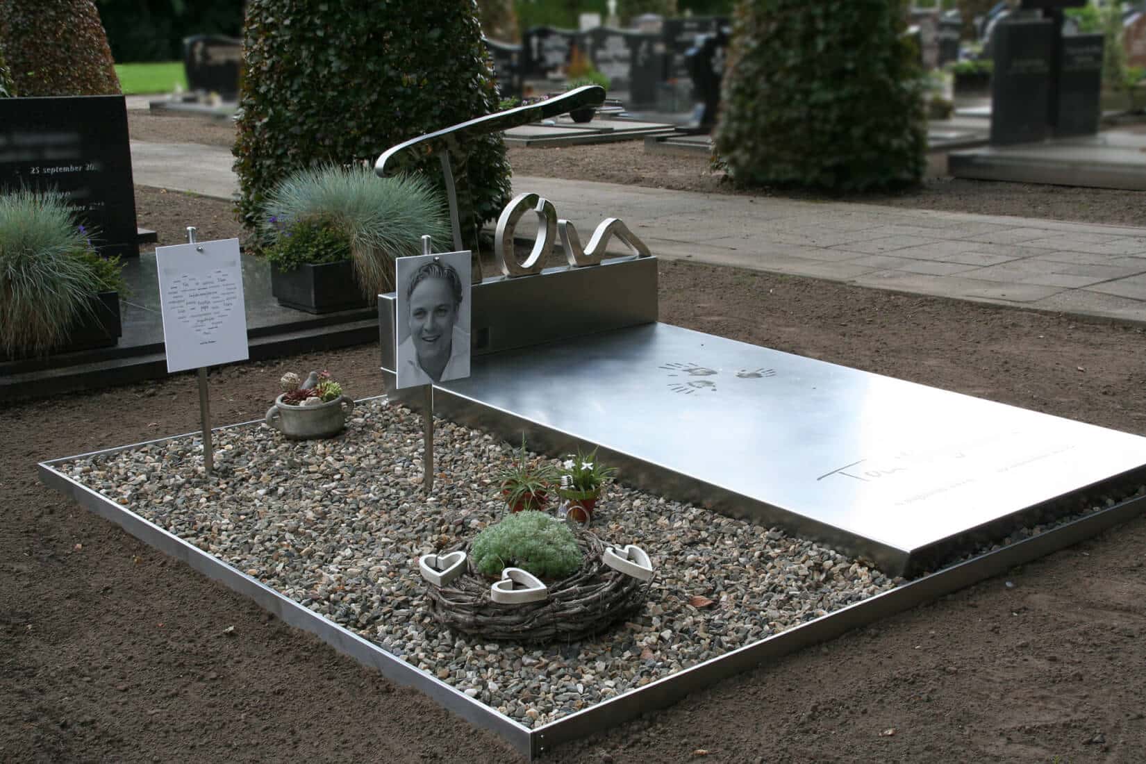 Het RVS in het moderne grafmonument is geschuurd en de letters zijn hoogglans gepolijst (spiegelend).