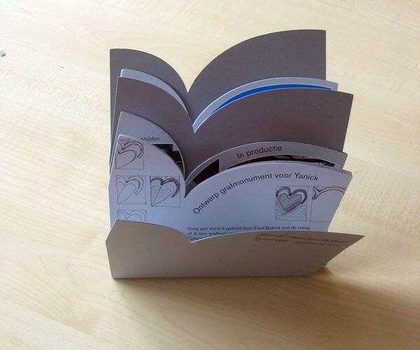Met het monument maakten we ook een uniek en bijzonder boekje. Dat kreeg de vorm van het gedenkteken voor Yanick. Het hele proces van de eerste schetsen tot aan de plaatsing van het RVS grafmonument is beschreven en geïllustreerd met veel foto’s.