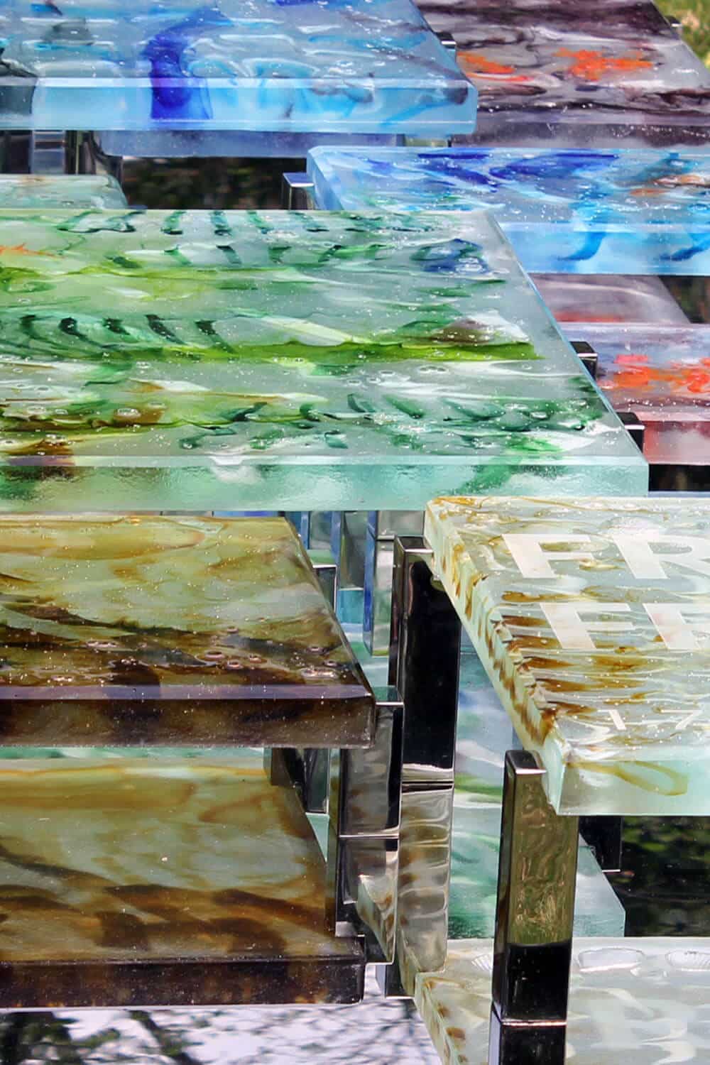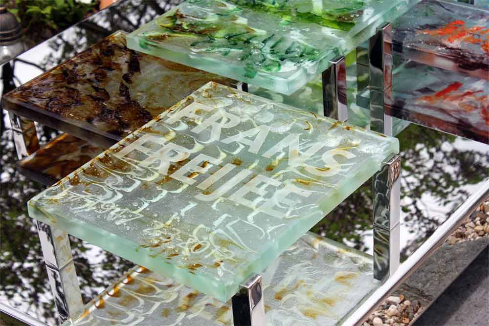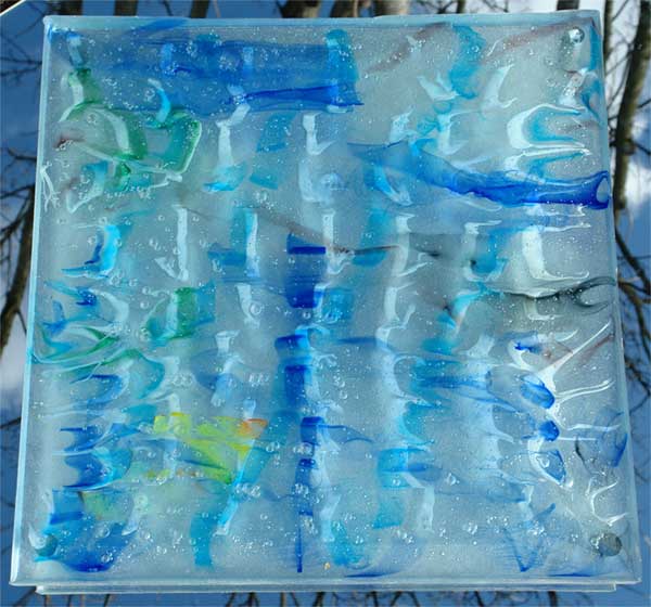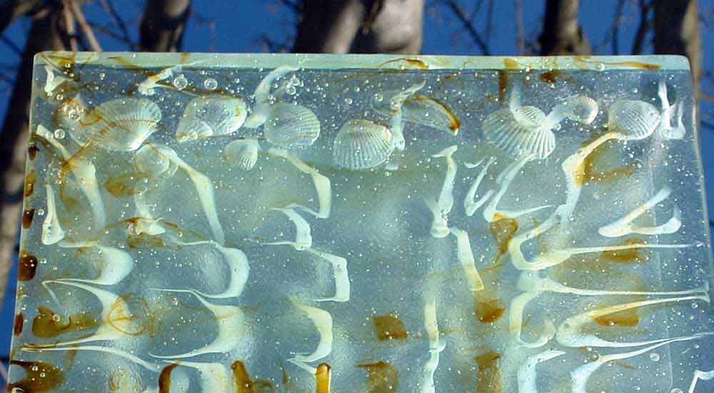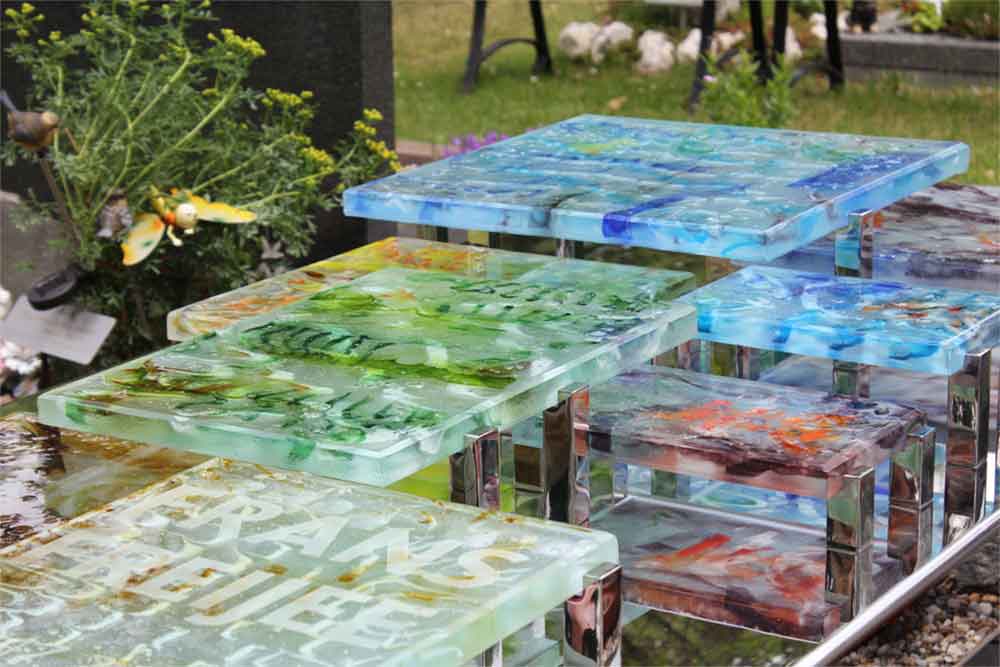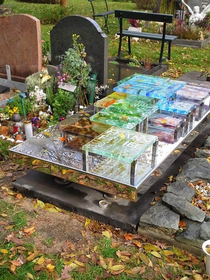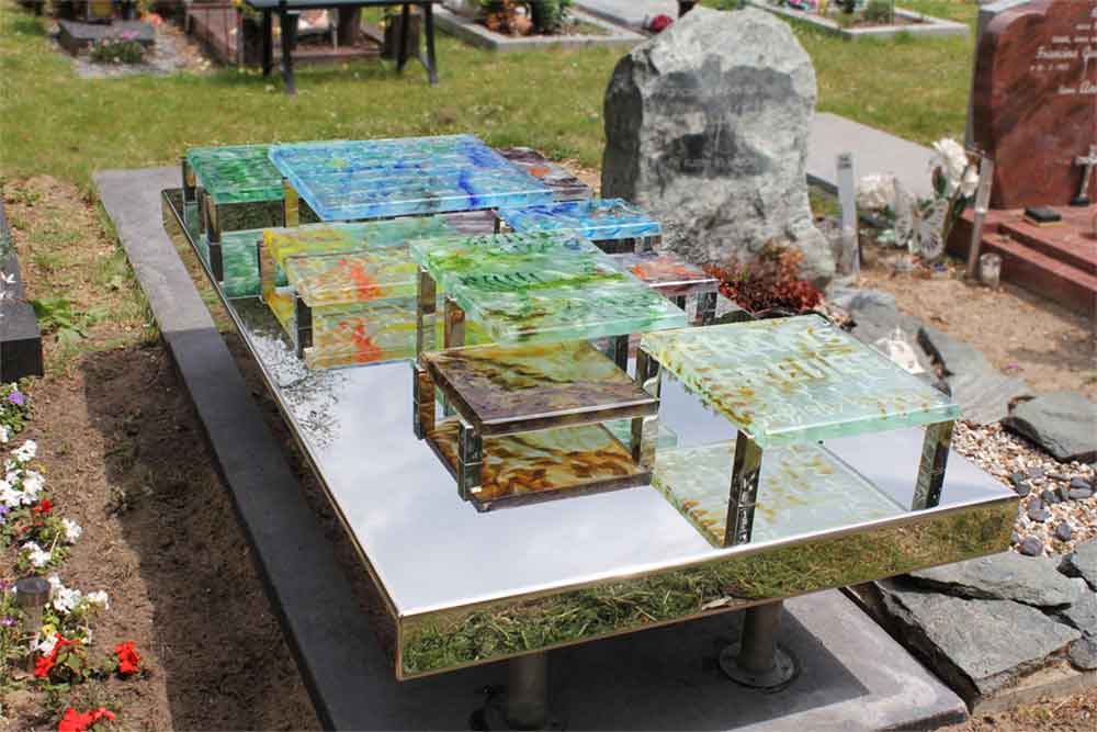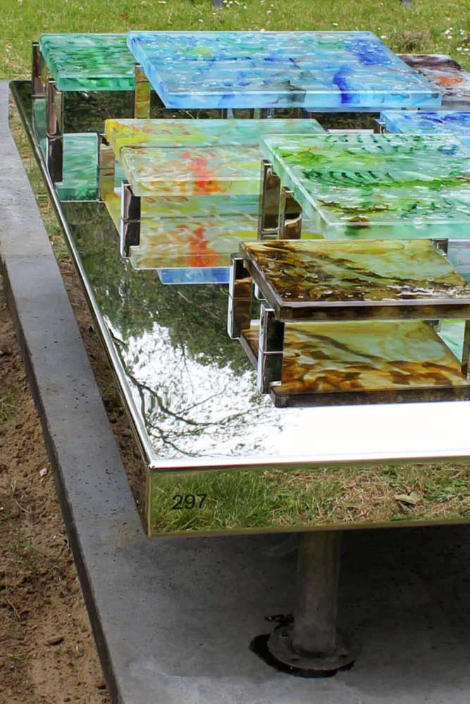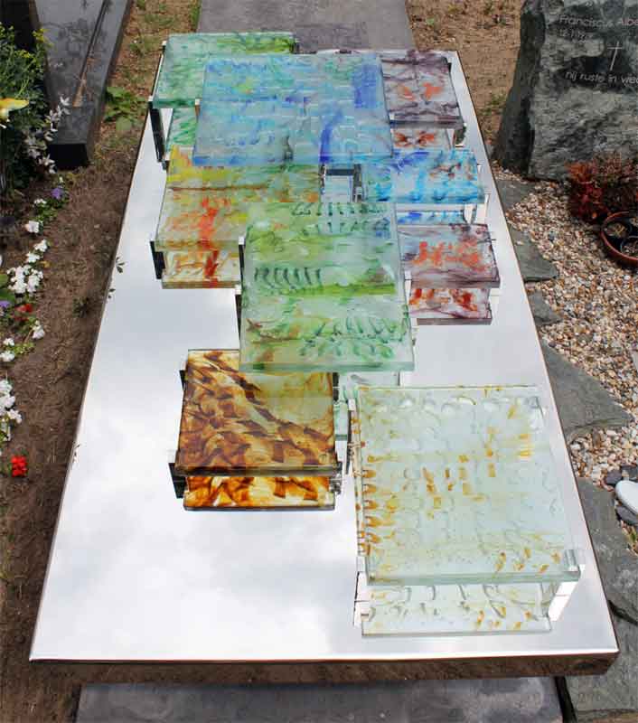 Het glas is gemaakt met een speciale giettechniek waardoor kleur diep in het glas gebracht wordt. De glasblokken liggen boven een spiegel van RVS. In het glas zijn afdrukken van schelpen opgenomen. Het is een kleurig en markant monument geworden. Op de begraafplaats de Nieuwe Ooster in Amsterdam valt het zeker op. Op een zonnige dag plaatsen we dit monument samen met Ans en vrienden.