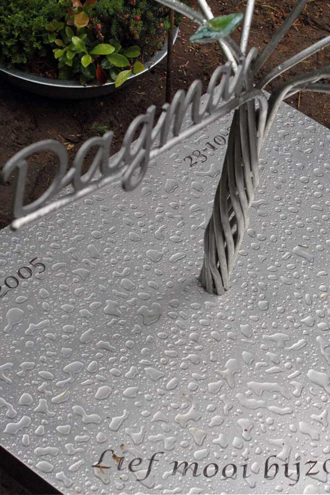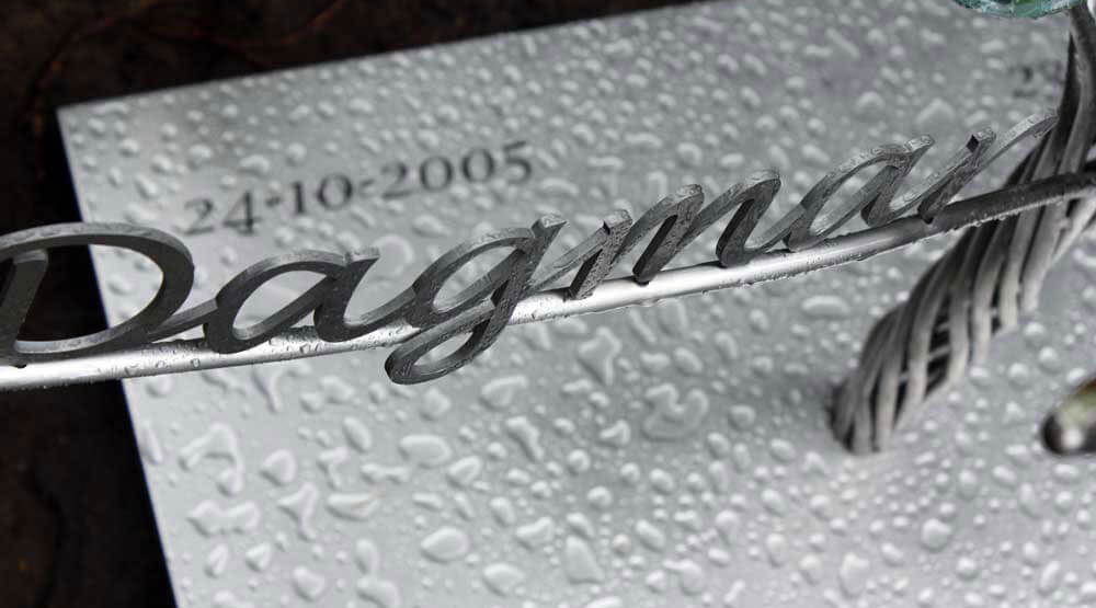 Met laser sneden we uit dikke RVS plaat de naam “Dagmar” uit en straalden het RVS vervolgens met glasparels om het een extra mooi en fluweelachtig oppervlak te geven. De naam werd bovenop een tak vastgezet die met de tekst “meeloopt”.