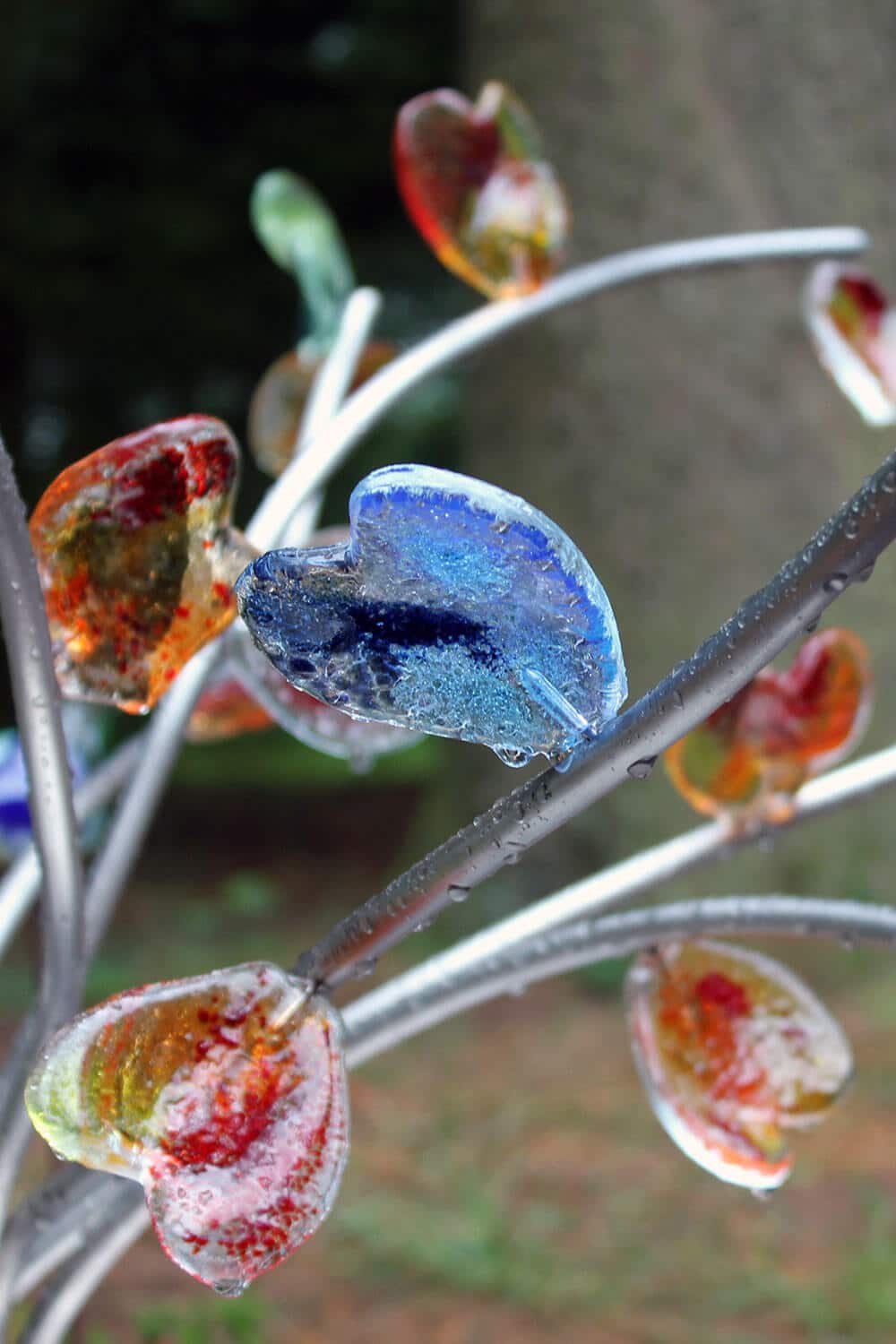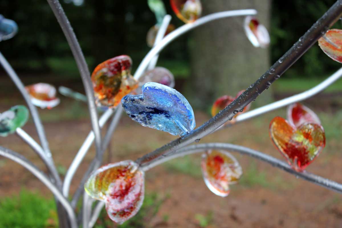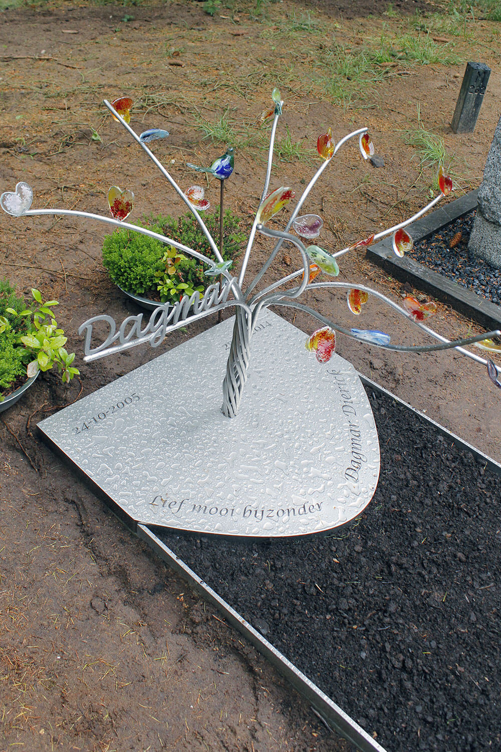 Dagmar’s vader opperde om op een aantal plekken de stam “open” te houden. Dat idee pakte erg goed uit. De grillige stam en opbouw geven het boompje een extra cachet. Bijna alles aan dit kindermonument met hartjes is uniek en handgemaakt (het boompje, de hartjes/blaadjes van glas)