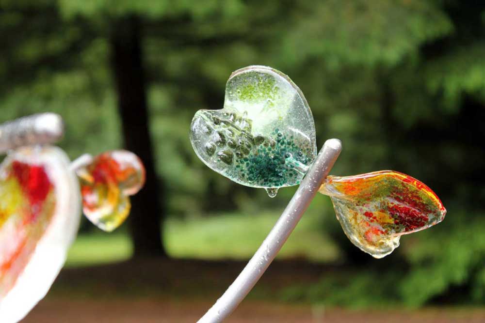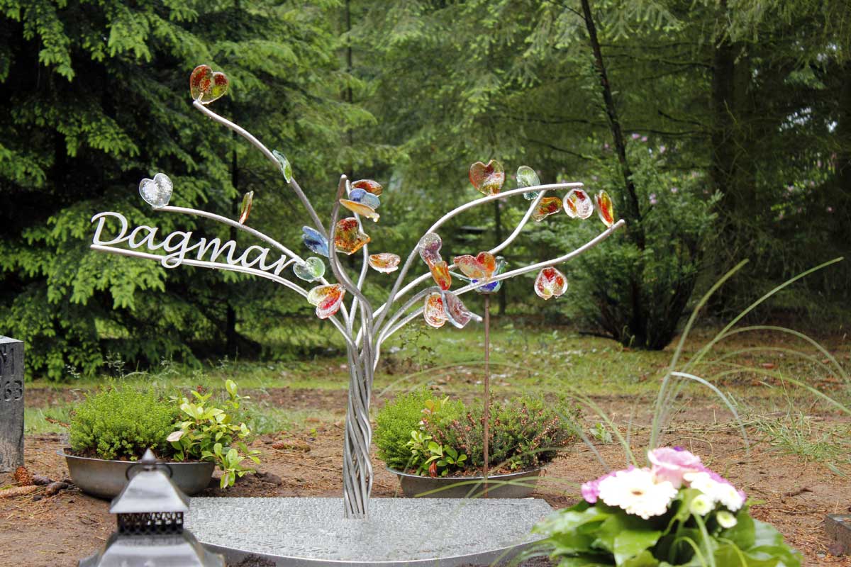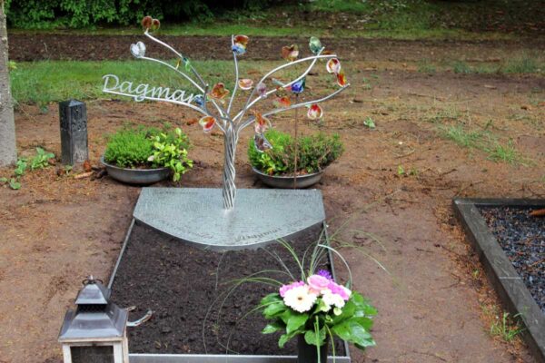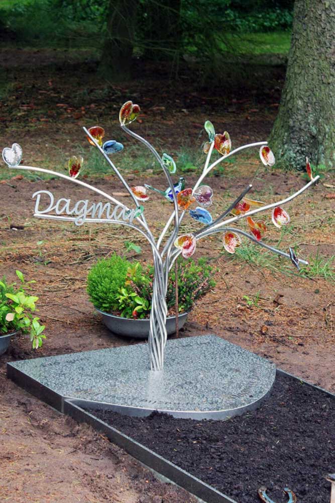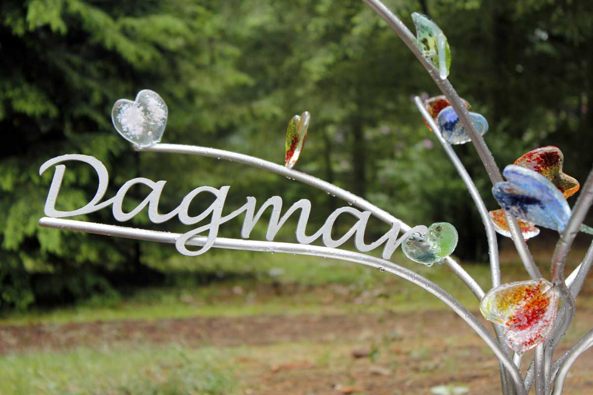Samen met het gezin ontwierpen we een boompje waar gekleurde glazen hartjes verdeeld zijn over negen verschillende takken. Met de kleurtjes die passend waren voor Dagmar. Het gedenkteken wilden we levendig en “organisch” maken.