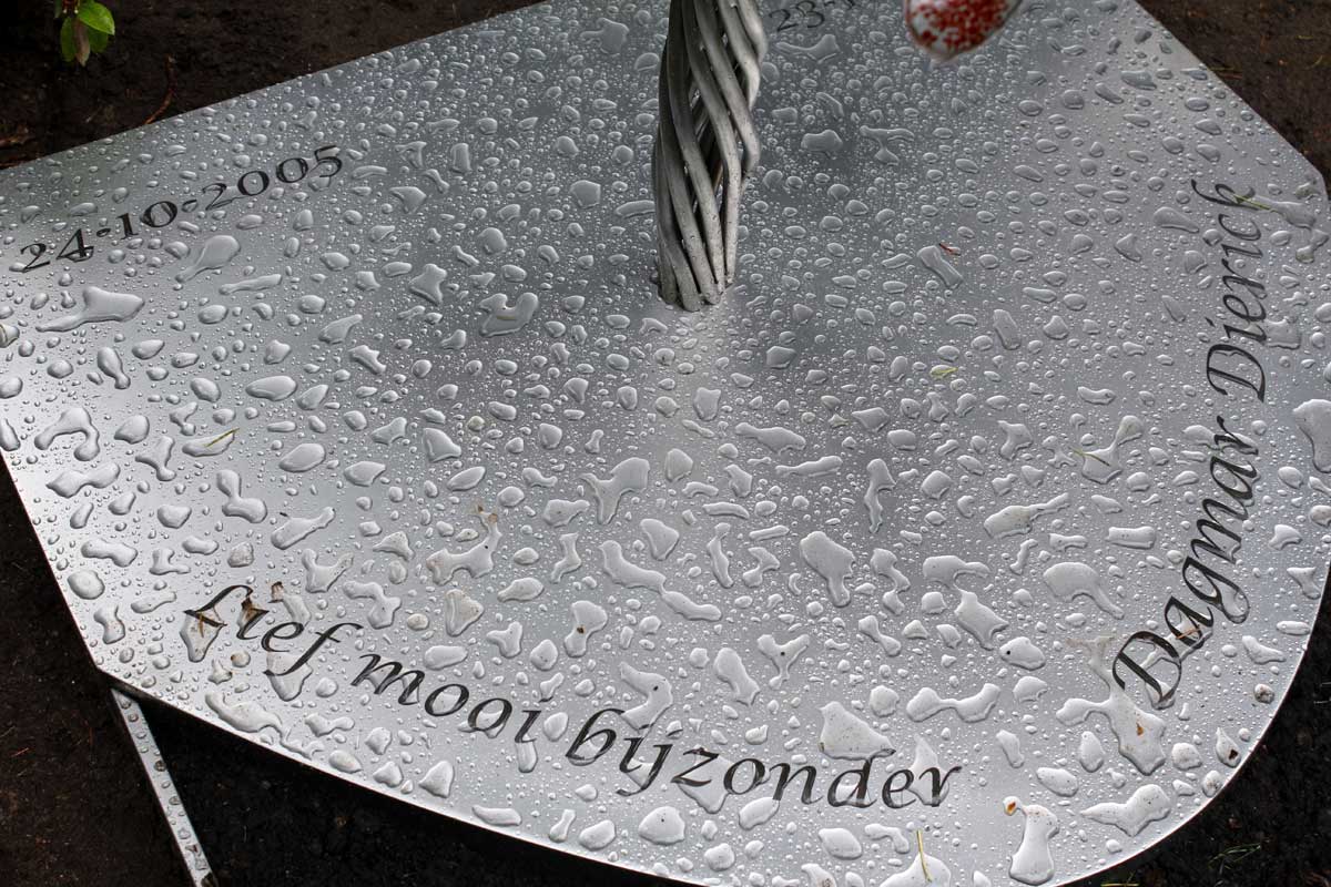Liever dan een traditionele kindergrafsteen wilden de ouders een persoonlijk en eigenzinnig kindermonument. Liefst van RVS met kleur, niet iets sombers.