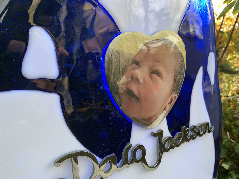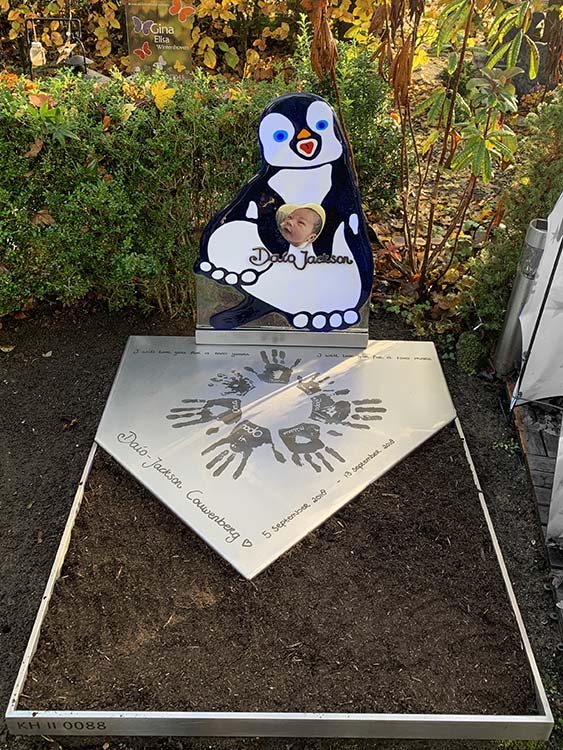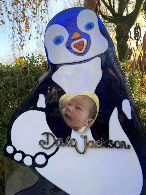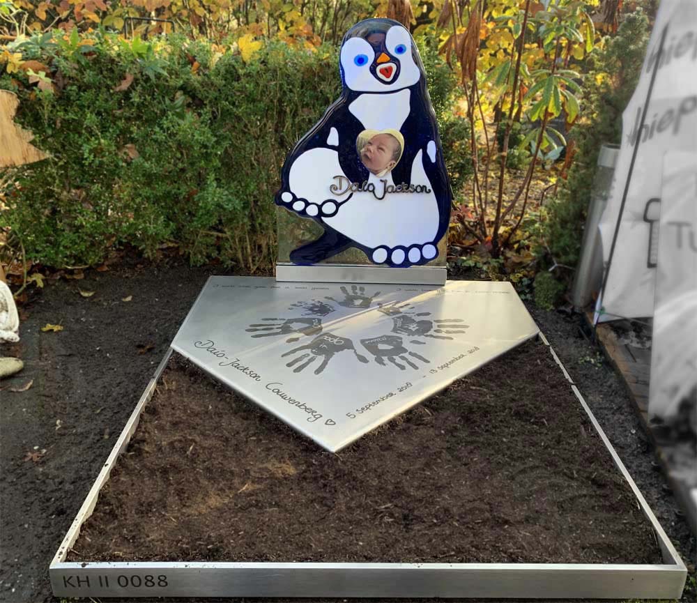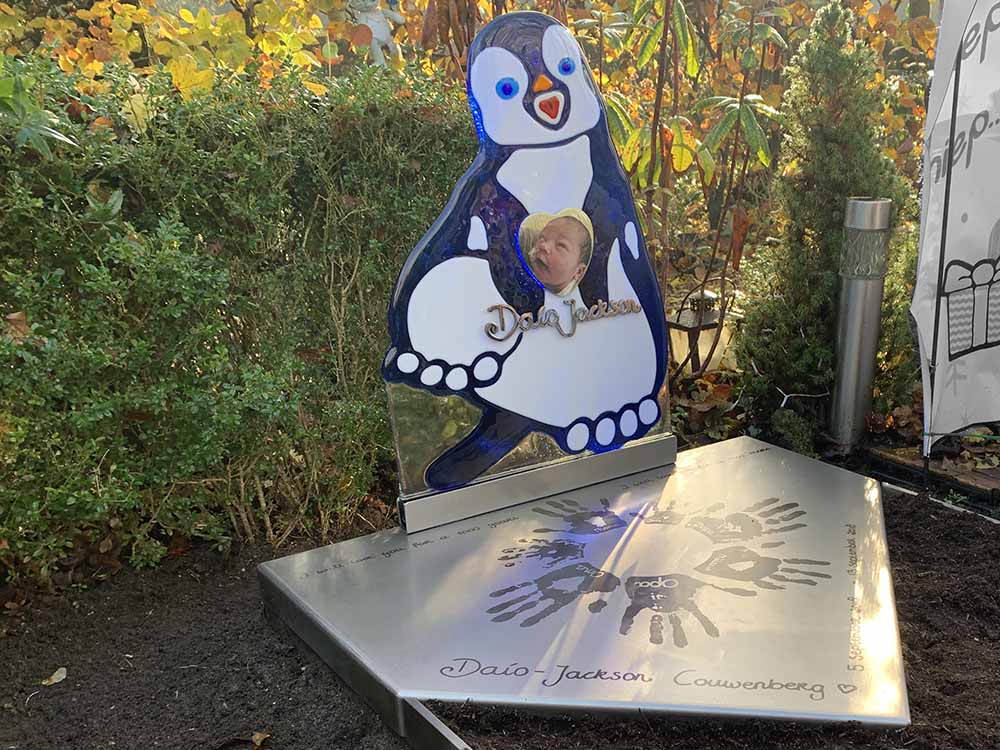 Een glazen pinguïn die in zijn flippers een hart met een mooie foto van baby Daío vasthoudt. Daaronder zijn naam in het handschrift van Sarella. De pinguïn staat op een RVS “ijsschots” met daarop handafdrukken van de nabestaanden en familie.