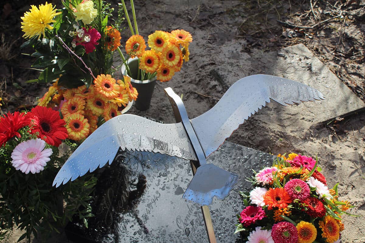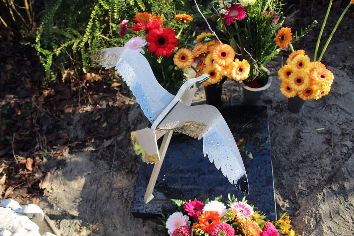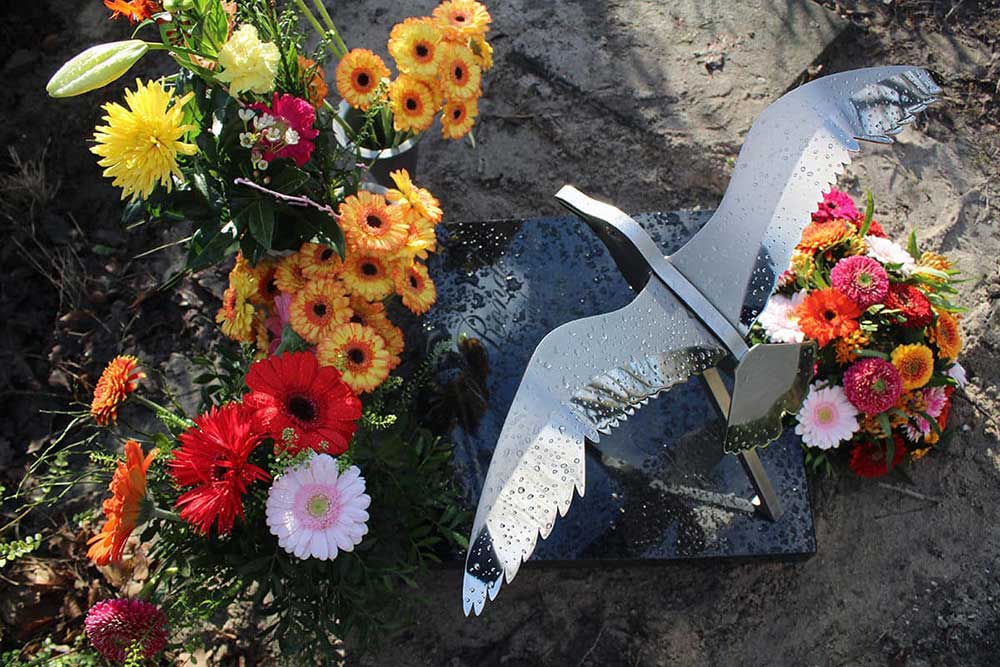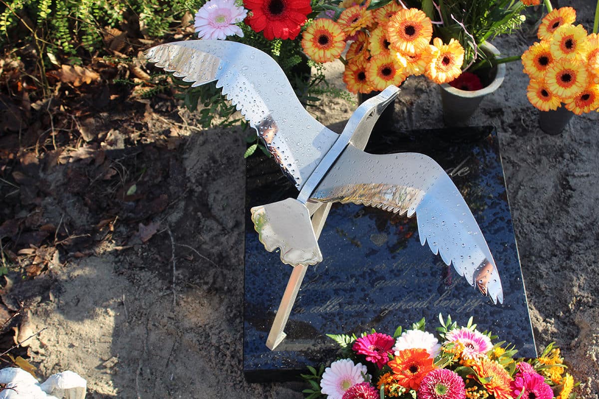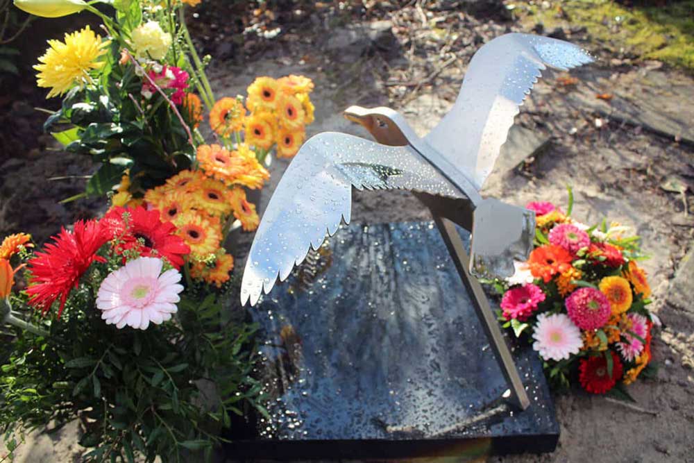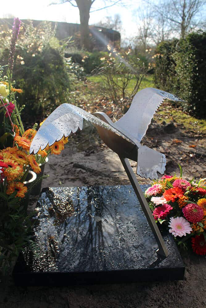 De vogel werd bevestigd op de kleine grafsteen en contrasteert mooi met het gepolijste zwarte graniet. De tekst werd in het graniet gegraveerd en bewust niet ingekleurd. Dat betekent dat als de steen droog is de tekst goed zichtbaar is. Als de steen nat wordt is de tekst meer subtiel aanwezig. Juist dit natuurlijke effect van verandering door natuurlijke omstandigheden sprak de familie aan. In het centrum (hart) van de steen is een klein hartje gegraveerd